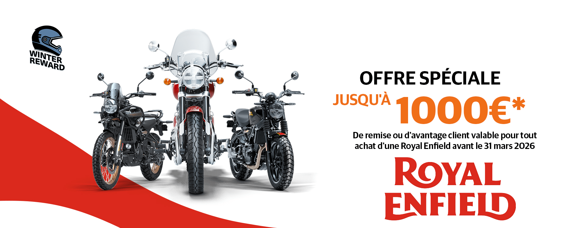 Jusqu’au 31 mars 2026, profitez d’une offre exceptionnelle sur une sélection de modèles Royal Enfield : jusqu’à 1 000€ TTC de remise immédiate sur la moto OU en bon d’achat à valoir sur les accessoires et vêtements.